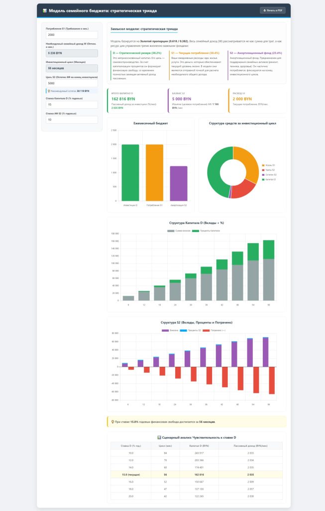 Калькулятор «Управление семейным бюджетом» – финансовая модель, основанная на принципе золотого сечения (φ ≈ 1,618), где все пропорции бюджета подчинены соотношению 38,2:61,8. Такая структура делает бюджет самоподобным и масштабируемым: от общего уровня дохода до отдельных подкатегорий расходов сохраняется одна и та же логика распределения средств.